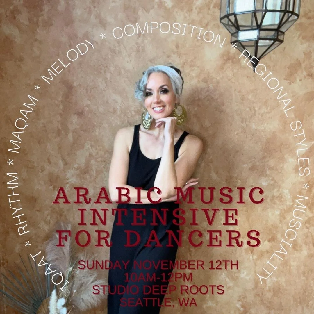 Join me for this info packed intensive breaking down concepts of Arabic music specifically for dancers. Learn the essentials of rhythm, maqam, melody, composition, regional styles, and musicality. This is mainly a lecture class with some movement. Bring a notebook and a hunger to learn. Let’s dive in! Sunday, November 12th, 2023 10am-12pm at Studio Deep Roots, 9728 Greenwood Ave N., Seattle, WA 98103 $50 presale / $60 at the door SHOW & WORKSHOP combo for $65!!! Register TODAY HERE!!!