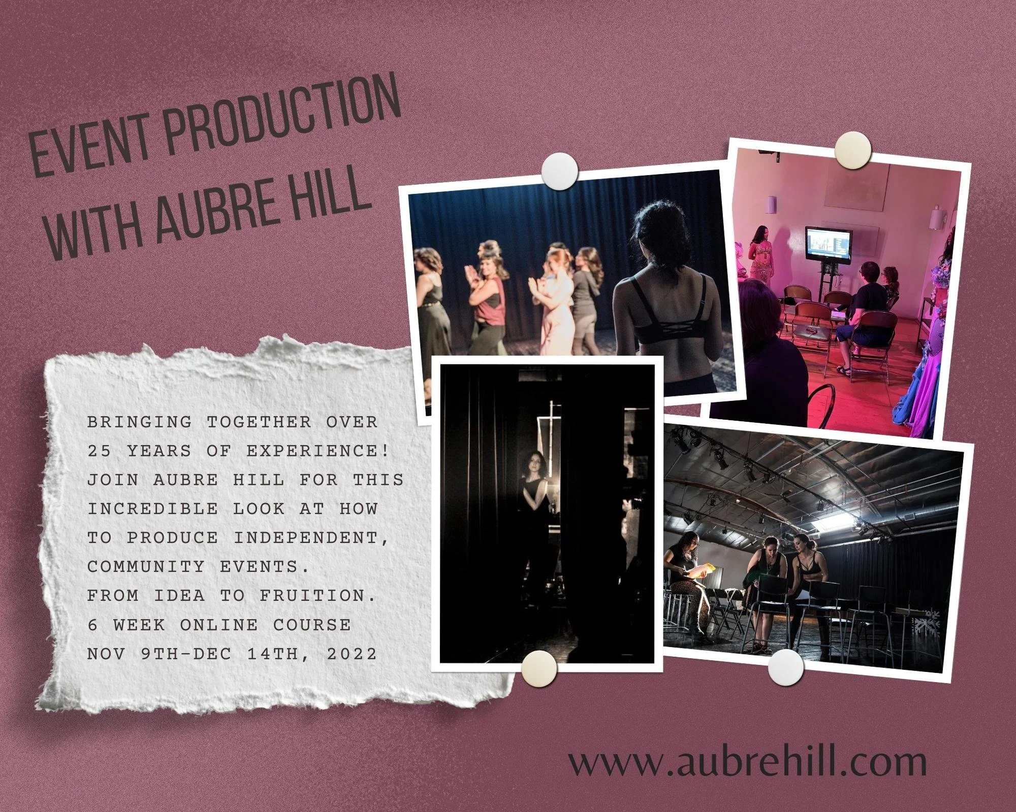 Bringing together over 25 years of experience, join me for this unique 6 week online course on Independent, community event production! This course will meet online Wednesdays 7-9pm pst with recordings available, November 9th-December 14th, 2022. We will be working from idea to fruition including : Proposals Venues Partnerships Timelines Branding Marketing Budgeting Visitor Experience Emergency Planning and more!
